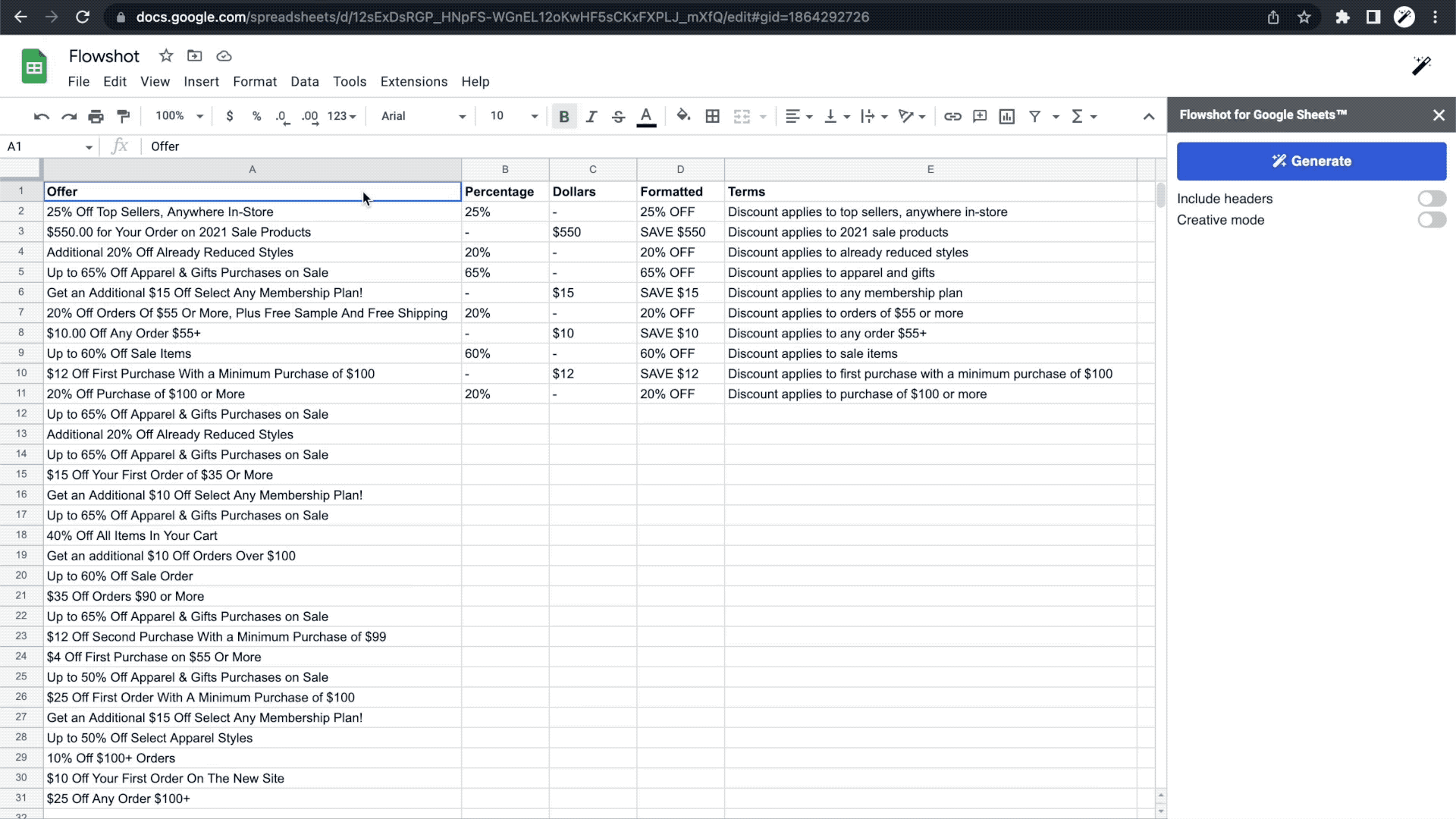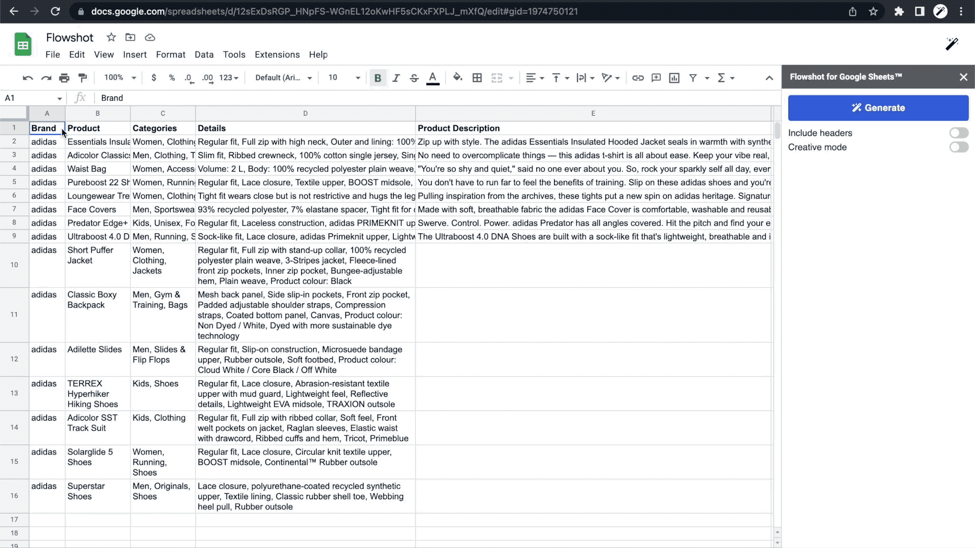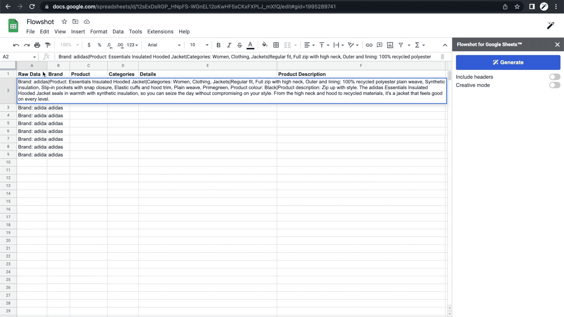 Head to the Google Workspace Marketplace to install Flowshot to your Google account. You'll then see Flowshot in your Google Sheets documents in the toolbar under "Extensions".